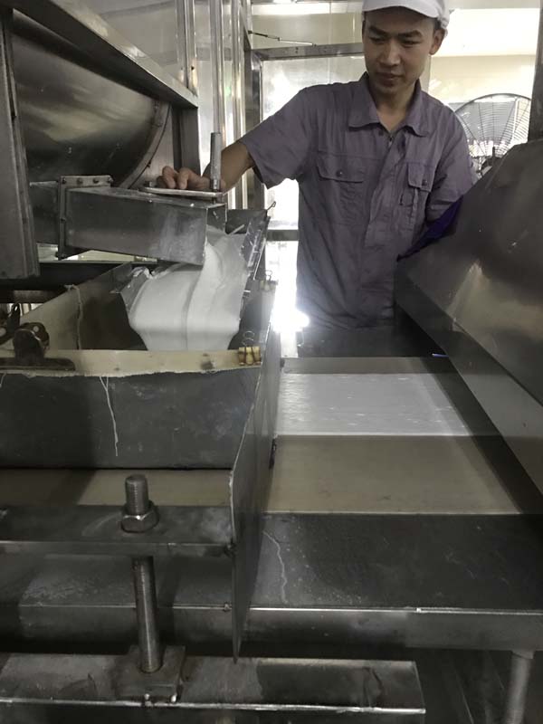 After steaming for a few minutes, rice sheet will be feeding into the extruder, and then extruded into rice paste sheet which increase its density;