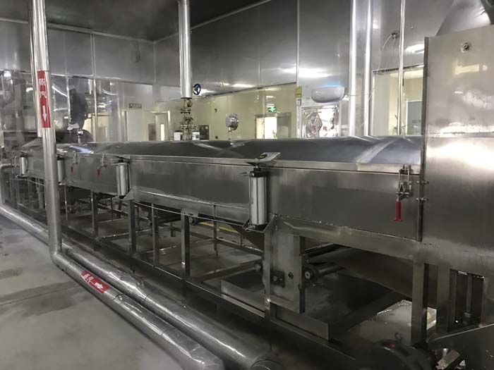 After cooking, rice noodle is conveyed to continuous steamer, and the steamed rice noodle is fully cooked.